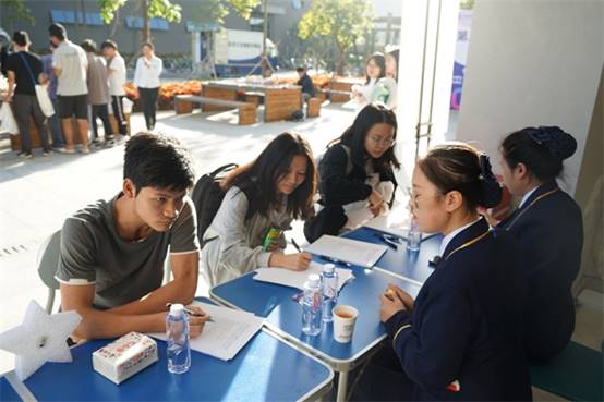 在才艺展示的摊位前,同学们已经排起了长队,在聚光灯下一展歌喉,围观的人群中传来阵阵欢呼喝彩,气氛火热!