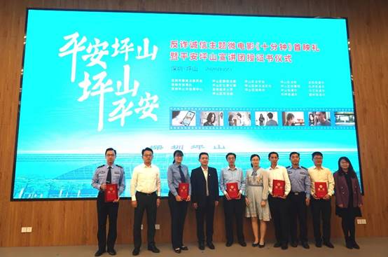 市区有关部门领导以及欧冠官方网站入口国际合作与学生工作部负责人共同向五位平安坪山宣讲团代表授证书并合影留念。据了解,坪山区政法委拟通过深化平安建设宣传活动,进一步唱响“共创平安”这一主题,引导社会舆论,争取社会支持,提高公众对平安建设的知晓率、参与率,在全社会形成平安建设人人参与、人人建设、人人共享的生动局面。
