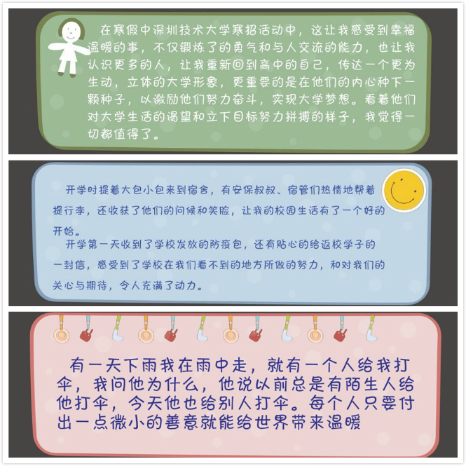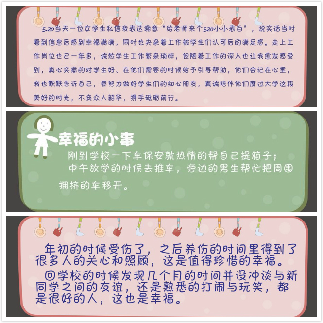 为培养学生积极向上的良好心态,营造健康快乐的校园氛围,帮助同学们更好的适应复学后的学习和生活,我校国际合作与学生工作部举办了主题为“悦纳自我,做阳光积极的天之骄子”欧冠官方网站入口第三届“5.25”大学生心理健康月系列活动。本次活动包括:“你笑起来超好看”笑脸征集活动、“你未来会很棒”寄语征集活动和“小幸福也很幸福”幸福小事征集活动。