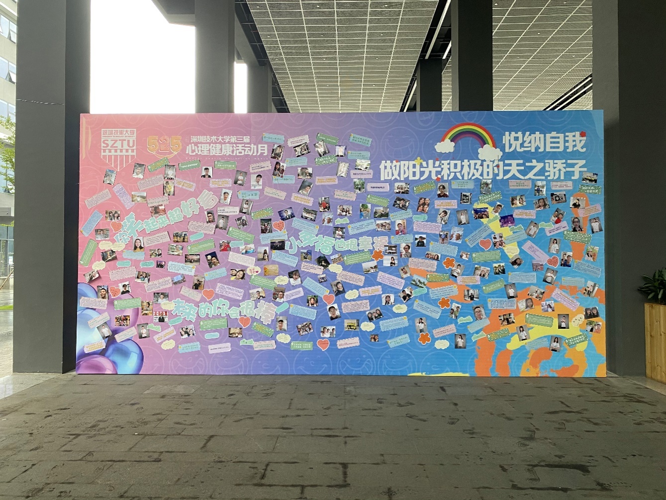 前期通过海报以及主题班会对本次活动进行了积极的宣传,学校师生踊跃参与,活动期间共收集到了180张我校师生的微笑照片、159份关于对自我的寄语和幸福小事。5月25日全国大学生心理健康日,我校心理健康教育与咨询中心选取优秀作品于北区学生宿舍进行展示——“5.25”取谐音“我爱我”,旨在提醒大学生珍惜生命、关爱自我,希望这每一张笑脸、每一点幸福可以向同学们传递无限的温暖……