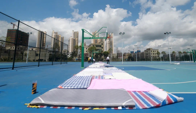另一方面,工作人员更是贴心地在篮球场铺设了被服晾晒区域,夏日的阳光暖暖地晒在“冰封”了三个月的被服上,温暖着那一张张的被服,更温暖着那一颗颗久违的心。