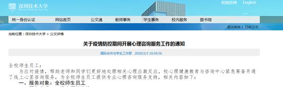 为应对疫情,帮助老师和同学们更好地处理相关心理应激反应,为全校师生员工提供专业心理咨询服务支持,校心理健康教育与咨询中心在第一时间紧急筹备开通了线上心理咨询服务。线上心理咨询服务主要采用QQ线上预约咨询服务方式,在每天的上午8:30—12:00,下午14:00—17:30提供服务,紧急情况下可直接通过QQ语音呼叫联系工作人员,不受工作时间和预约限制。同时也为师生公布了市级和区级精神卫生中心24小时免费心理援助热线。自线上心理咨询服务开社至今,线上心理咨询服务为部分同学提供了及时、专业的心理服务。