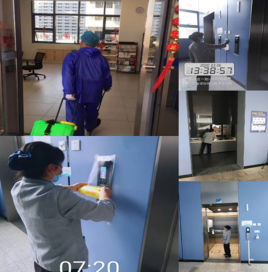 消毒作业。每日电梯内不低于2次、其他电梯等候区、走廊、垃圾桶、公共区域等每日不低于2次消毒工作;卫生间、垃圾暂存点等易滋生细菌区域重点部位每日不低于1次含氯消毒剂500mg/L消毒。对各岗位办公值班区域物品表面每日不低于1次进行含氯消毒500mg/L剂擦拭,时刻保障学生的生命健康安全。