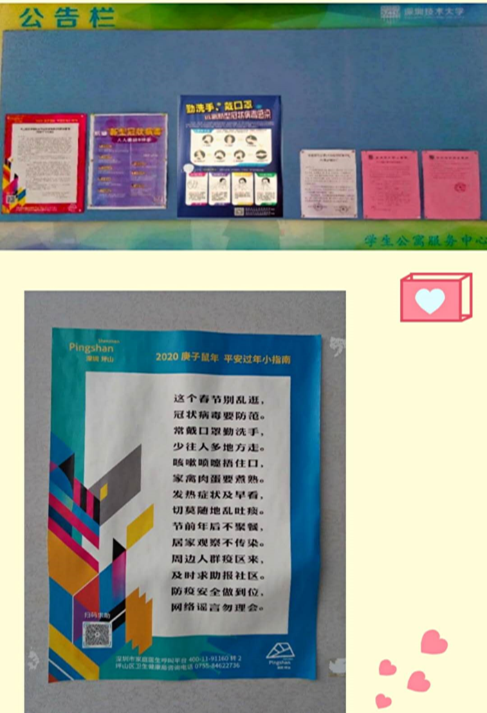 1月21日,学生公寓服务中心张贴第一份关于预防新型病毒感染的温馨提示。通过建立微信群,一对一告知等方式,配合相关部门及社区工作人员积极宣传预防冠状病毒感染常识。下图是其中一处:
