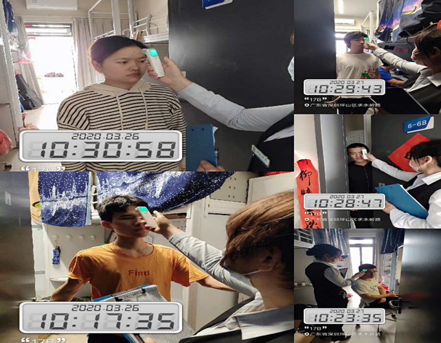 体温测量记录。对在岗员工和在校学生,每日不低于2次的体温测量并记录,时刻关注学生的身体状况。