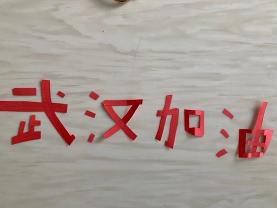 “虽然不是党员,也无法参与抗战疫情的一线,但我想为前线的工作人员出一份力。表达我对身处前线人员的敬意”,在这样的想法下,19级交通运输一班的钟和涛同学用红色卡纸剪成“武汉加油”四个大字,表达自己对武汉必胜的信心。卡纸鲜艳的红色,不仅代表着中国红,也是所有在前线的医护人员、官兵志愿者炽热鲜血的象征。