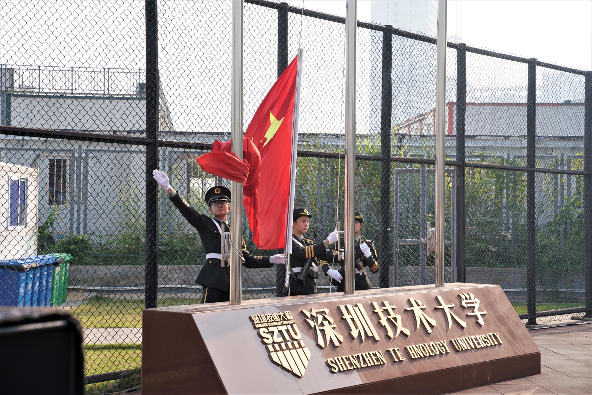 8时30分整,在铿锵有力、整齐划一的脚步声中,深技大国旗护卫队来到升旗台前。现场师生向国旗行注目礼,用嘹亮歌声为伟大祖国母亲献上最美好的祝福。