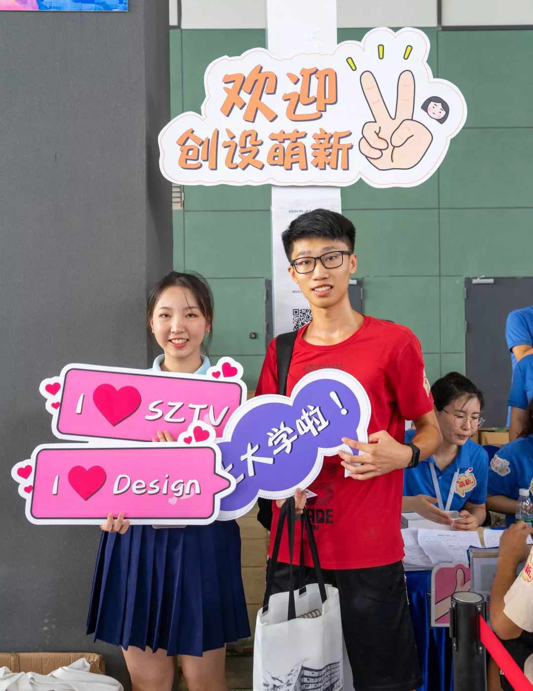 创意设计学院发挥学院特长,设计了一系列的拍照手举牌,新生物资袋里装着本子、笔袋和学院特色“速写本”,同时还为每位完成注册的同学在衣服上贴上可爱的“萌新”贴纸。