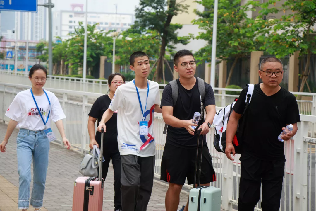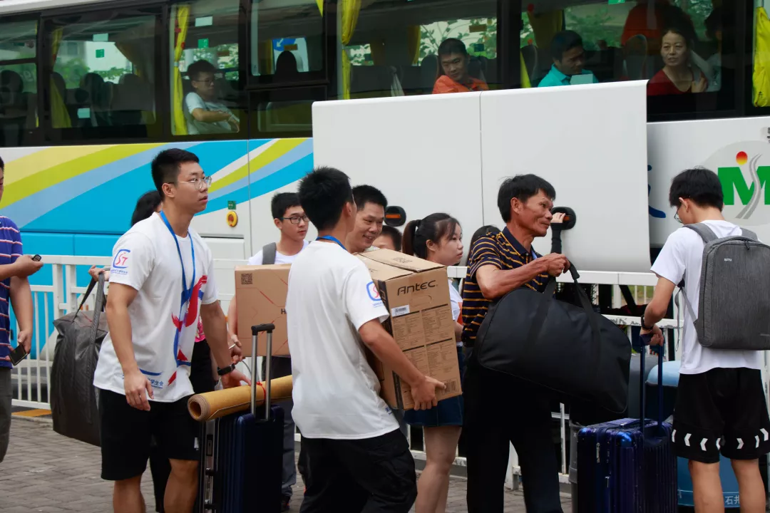 来自深技大学生会、义工联等学生组织的迎新志愿者们顶着炎炎烈日为大家指路、答疑、搬行李。汗湿的衣服、晒得通红的笑脸背后是他们对萌新们最诚挚的欢迎。