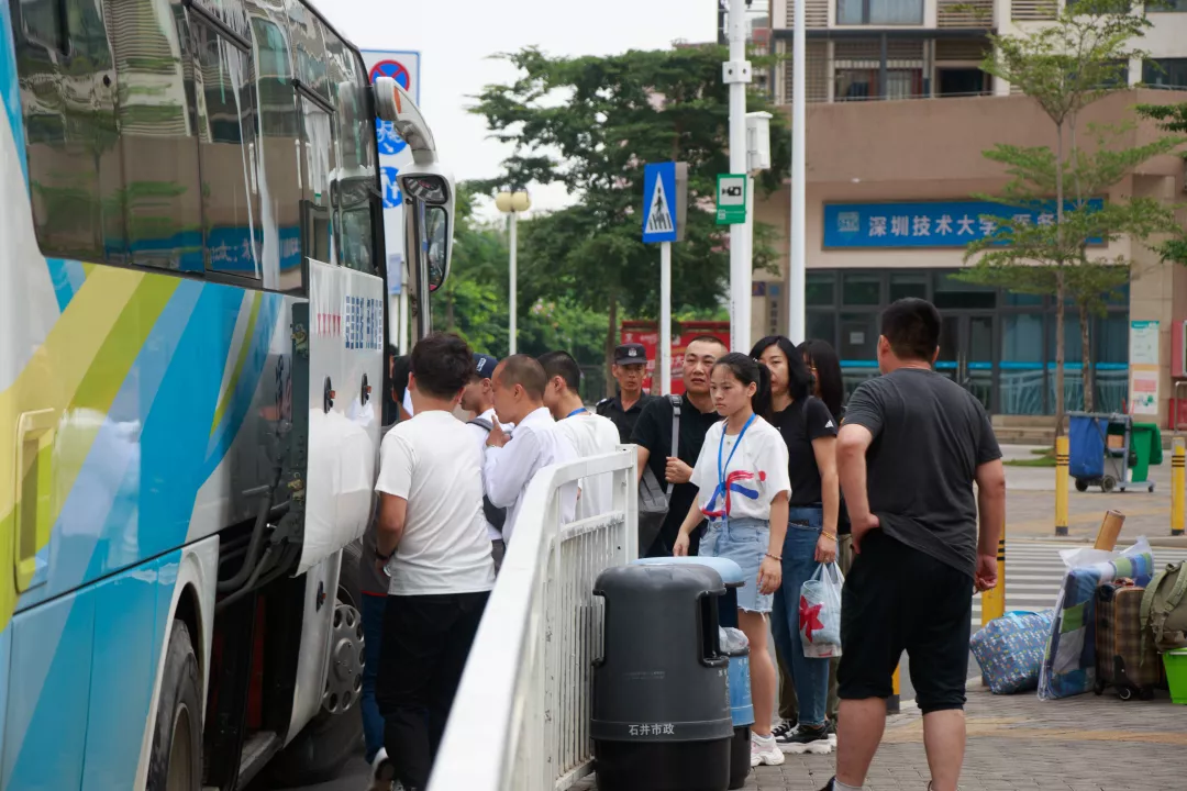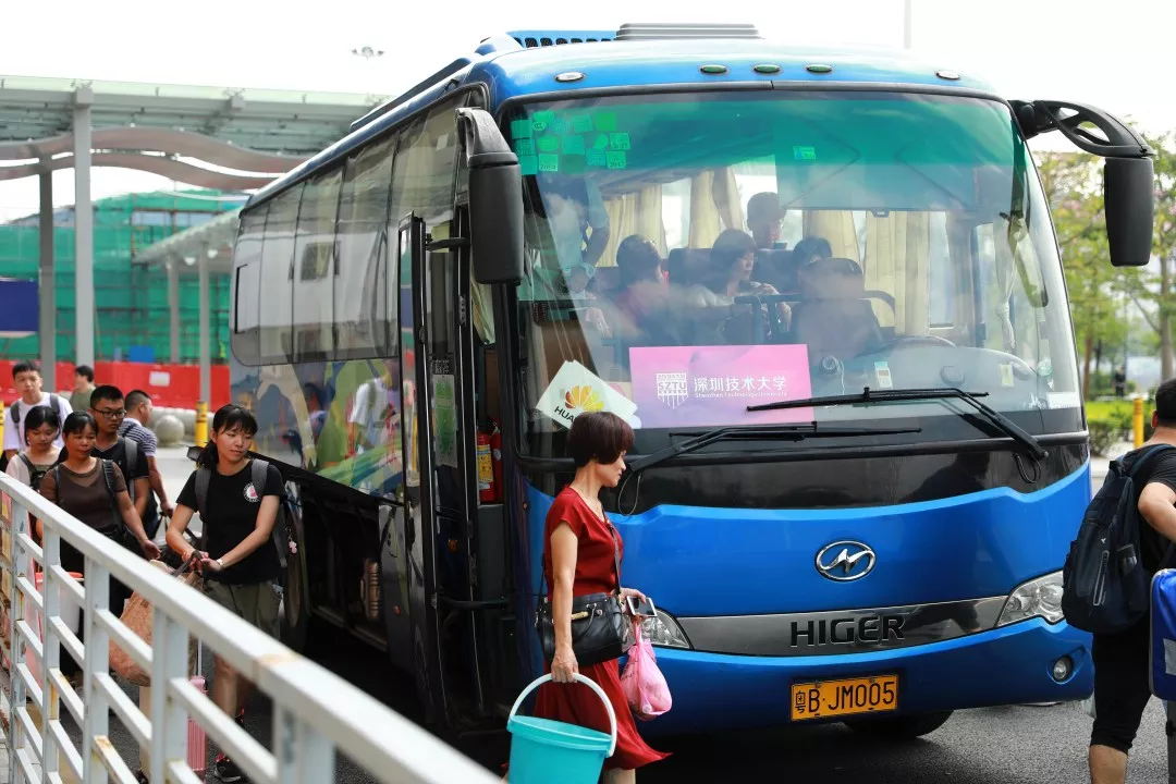 早晨7:53分,坪山高铁站接站点迎来了第一批背着技大背包的新生。