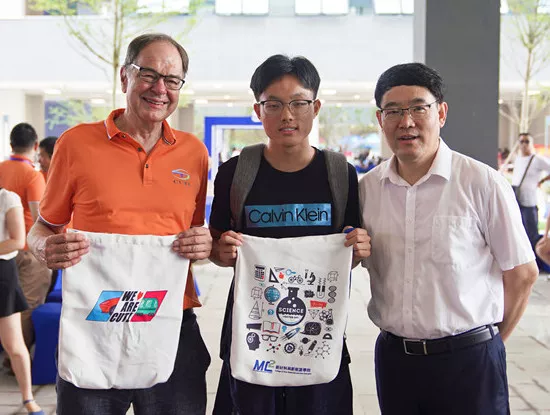 深技大校长阮双琛、城市交通与物流学院院长付朗兹·拉普茨与今日首位报到新生王秋宁合影
