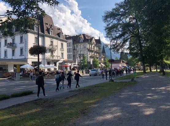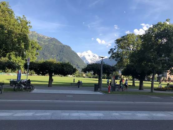 因特拉肯被誉为是瑞士最美的小镇之一,又名湖间镇,位于图恩湖和布里恩茨湖之间。中瑞学生徒步在小镇街道,街上有琳琅满目的店铺、餐厅、酒店等,抬头眺望便可看到不远处阿尔卑斯少女峰傲然矗立,与蓝天白云相互映衬,美得如此纯净。