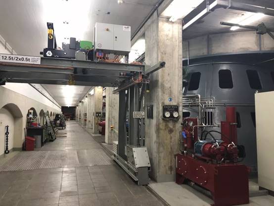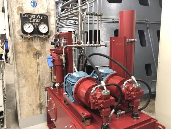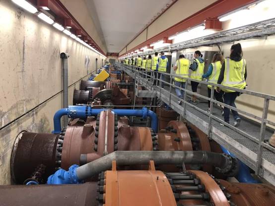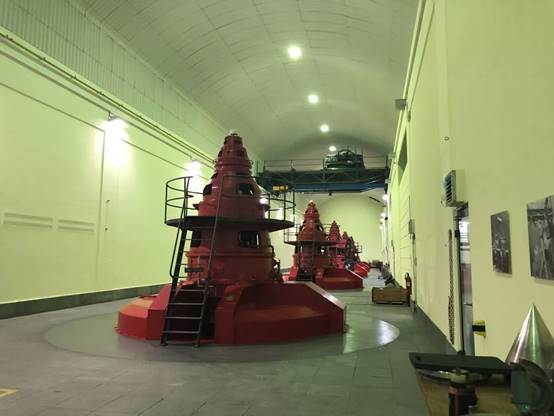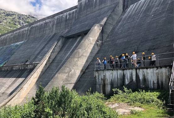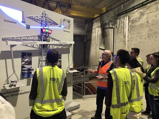 8月8日上午,KWO公司员工带领中瑞师生走进格里姆塞尔2号水力发电站(Grimsel 2, 瑞士最大的抽水蓄能电站之一)参观内部构造及重要设施,如水力发动机、水泵、变频器、冷却系统等。同时,利用模拟系统直观地向大家展示了水力发电的科学原理、触发条件、发电储能过程。KWO员工说,格里姆塞尔2号水力发电站配备了四个100 MVA同步机组,每个机组都有一个单独的混流式涡轮机和水泵在同一轴上发电或抽水。当发电量大于实际用电量时,多余的电量会用来将水抽到更高的水坝储存起来以备缺电时使用,提高电力供给的稳定性,也提升了清洁能源利用效率。