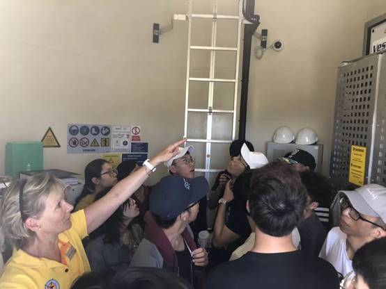 解说员为中瑞师生描述了风能发电站的建设历史、发展规模,并介绍风机的外部构造,随即带领大家进入风机观察其内部设施和学习设计原理。