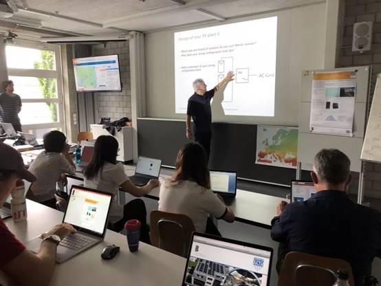课程的另一个特点是项目实用性强、紧贴日常生活。第二周课程围绕太阳能光伏应用展开,任课教授Urs Muntwyler是太阳能光伏领域的专家、现任BFH太阳能光伏实验室负责人、Solarcenter Muntwyler AG公司前首席执行官,他生动地描绘了可再生能源及光伏的未来前景,强调推广使用新能源的迫切性,随后深入讲授太阳能光伏系统的组成和类型、应用及发展趋势,分析太阳光伏系统的发电效率影响因素等。