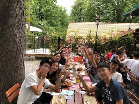 晚上六点,慕尼黑依旧是阳光普照,毫无夜色。同学们来到慕尼黑历史悠久的啤酒馆Augustiner Bräu München,与两位教授、外事处人员及学生助理共进晚餐,共庆项目的圆满结束。在气氛热闹的啤酒园里,树荫之下,大家谈笑风生,讲述着两周以来的各种收获与趣闻趣事,言语之间透露着不舍,最后大家共同举杯,用相机记录这难忘的一刻。