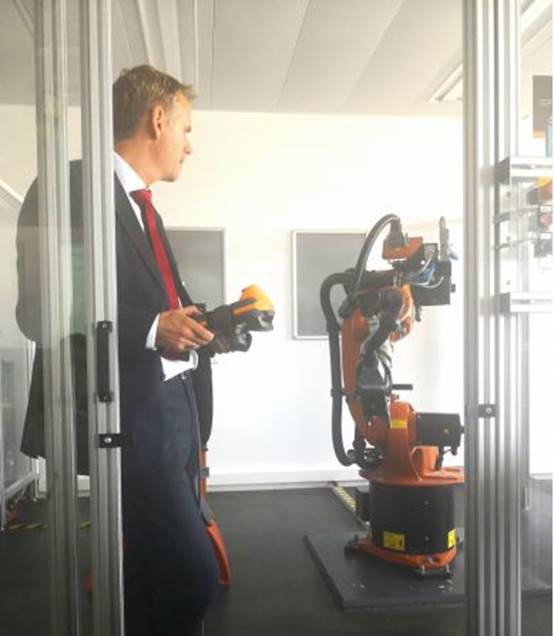 肯普滕大学的教授向我们普及了关于KUKA机器人的知识,同时向我们展示了KUKA机器人的编程原理以及运作过程。比如说协作机器人,由六轴机械臂具有极高的操作难度,因此直接对其进行“工作教学”将更具有现实意义,而教授向我们证明了这一点。当庞大的机械臂在教授的操控下开始有序地运动,其灵活度让我们目瞪口呆,恍如隔着玻璃门即上映着一部科幻大片,紧张刺激。机械臂的高效和精准等优势决定了其在未来世界中的广泛应用,我们也将拭目以待。