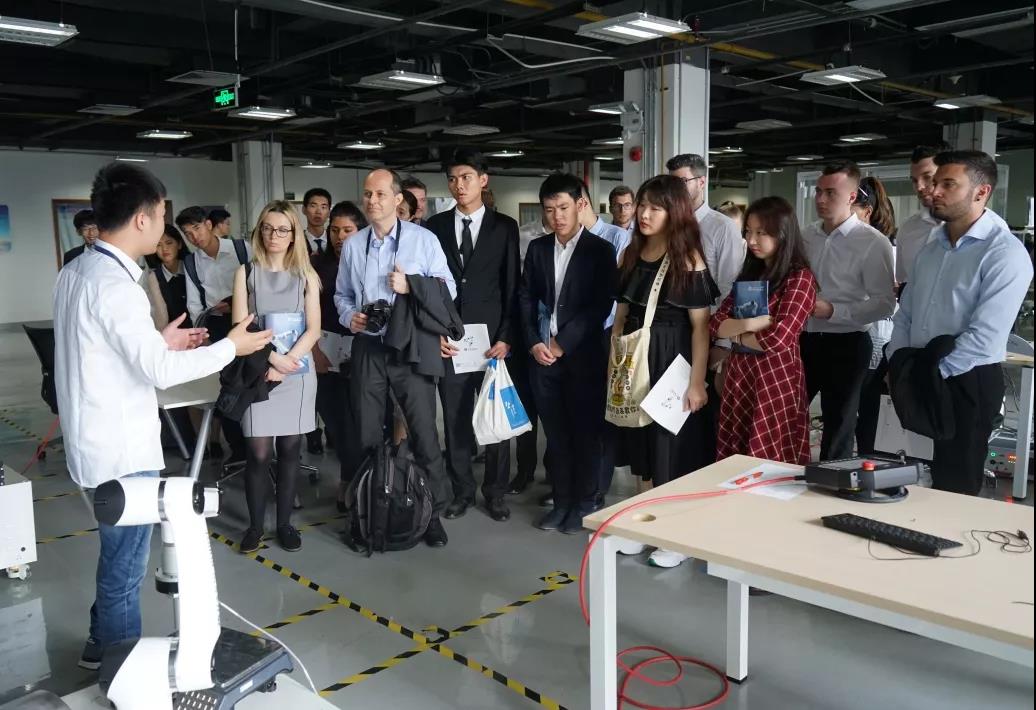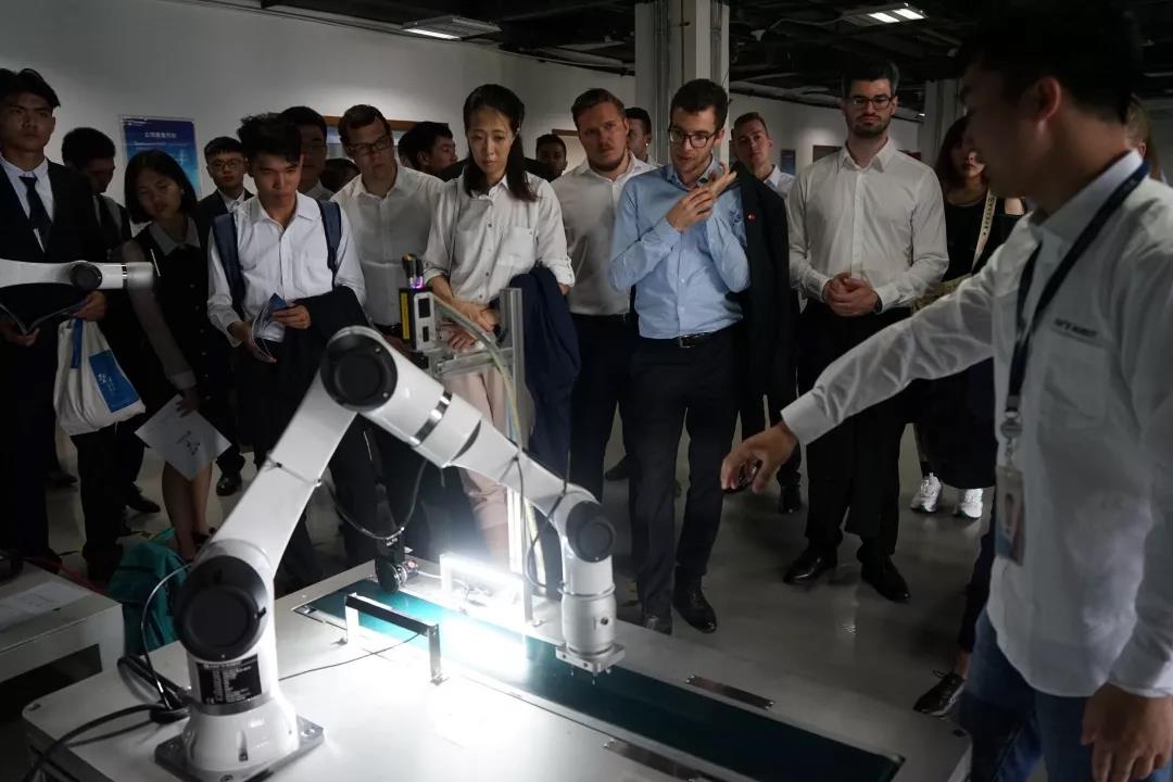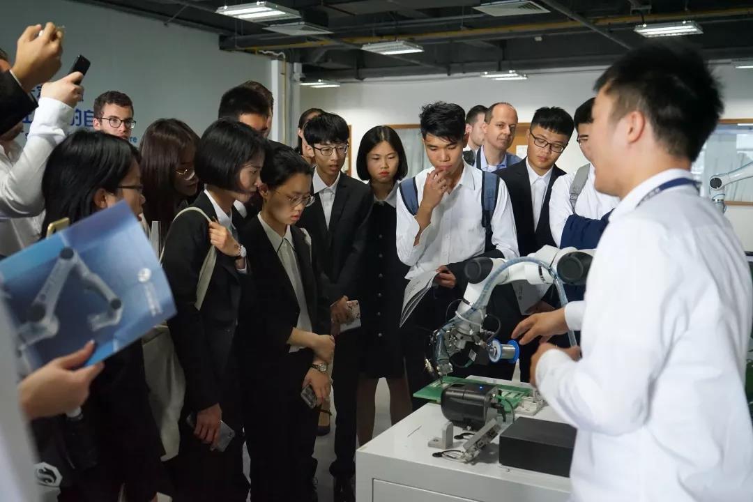 接着,中瑞师生来到大族机器人有限公司,刚踏进大门便见墙上写着公司的使命:“推动机器人服务于各行各业,解放人民的双手,最终服务全人类。”看得学生们热血沸腾,激起了浓烈兴趣 。讲解员带领中瑞师生们共同观摩了Elfin系列协作机器人、HM水平多关节机械手、Star机器人、Cute系列机械臂等产品和操作流程。