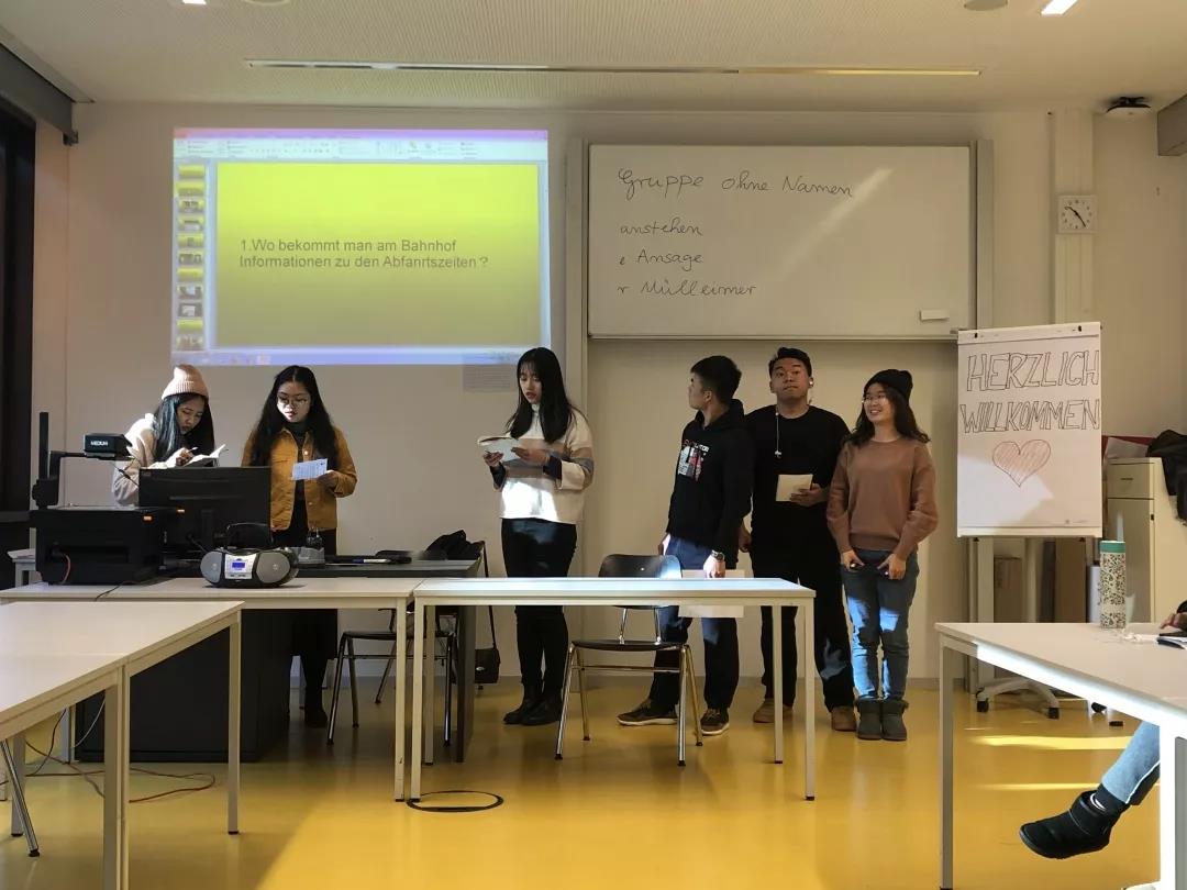 周四上午在最后的德语培训课程上,同学们按照老师的要求使用德语做了关于德国公共交通系统调研和分析的Presentation。同学们分组就德国铁路系统的运行,如何使用公共交通,火车延误处理等内容进行了分析和解说。