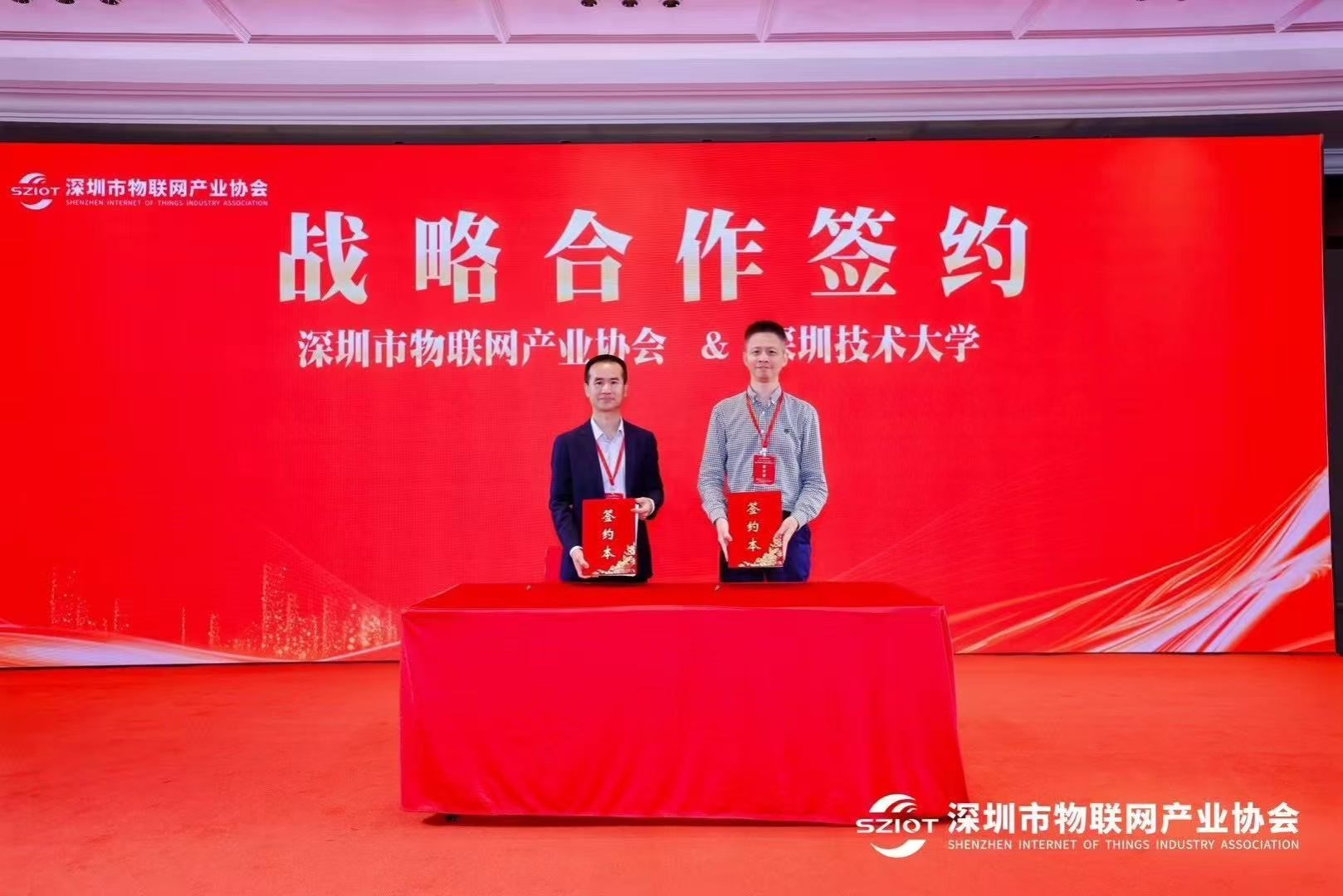 欧冠官方网站入口大数据与互联网学院副院长许强华、深圳市物联网产业协会执行会长杨伟奇代表双方签约