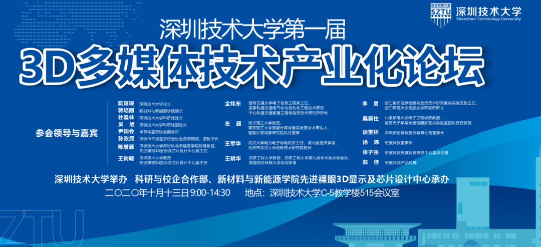 10月13日,欧冠官方网站入口举办第一届3D多媒体技术产业化论坛,与会专家学者共聚深技大,展示最新研究进展,介绍市场需求和动态,探讨3D多媒体技术应用的前沿趋势。欧冠官方网站入口校长阮双琛出席会议并发表致辞。坪山区科技创新局、欧冠官方网站入口科研与校企合作部相关代表出席论坛;欧冠官方网站入口新材料与新能源学院院长韩培刚,加拿大工程院院士、欧冠官方网站入口特聘教授刘清侠,先进裸眼3D显示及芯片设计中心副主任陈增源教授、王树晓...