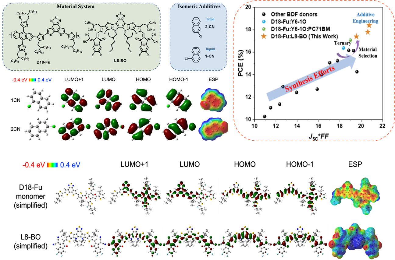 有机太阳能电池(OSCs)因其柔性、半透明性、高室内光匹配性、单位重量发电量高等特点,在分布式光伏应用方面具有潜在优势。目前,OSC 领域中的高功率转换效率(如PCE>19%)全部都是由基于苯并[1,2-b:4,5-b']二噻吩 (BDT) 结构单元的聚合物给体实现的。与BDT相比,苯并 [1,2-b:4,5-b'] 二呋喃 (BDF) 单元的尺寸更小,空间位阻更小,可以使得分子堆积更紧密、电荷载流子的流动性更高。同时,呋喃具有生物可再生性,比噻吩更环保...