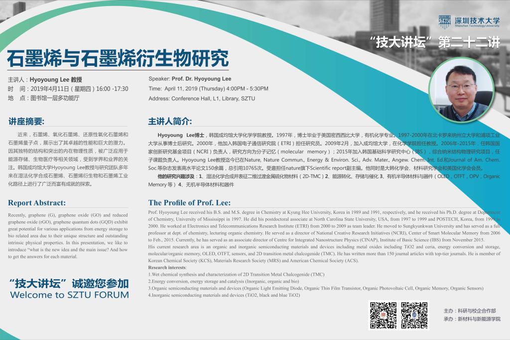 时间:2019年4月11日(星期四)16:00-17:30地点:图书馆一层多功能厅主讲人:Hyoyoung Lee教授主题:石墨烯与石墨烯衍生物研究讲座摘要:近来,石墨烯、氧化石墨烯、还原性氧化石墨烯和石墨烯量子点,展示出了其卓越的性能和巨大的潜力。因其独特的结构和突出的内在物理性质,被广泛应用于能源存储、生物医疗等相关领域,受到学界和业界的关注。韩国成均馆大学Hyoyoung Lee教授与研究团队多年来在湿法化学合成石墨烯、石墨烯衍...
