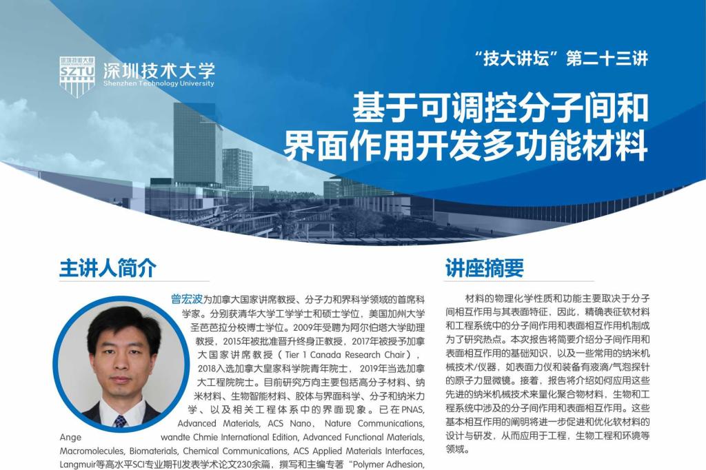 时间:2019年4月26日(星期五)14:00-15:30地点:11号楼1楼学术报告厅主讲人:曾宏波教授主题:基于可调控分子间和界面作用开发多功能材料讲座摘要:材料的物理化学性质和功能主要取决于分子间相互作用与其表面特征,因此,精确表征软材料和工程系统中的分子间作用和表面相互作用机制成为了研究热点。本次报告将简要介绍分子间作用和表面相互作用的基础知识,以及一些常用的纳米机械技术、仪器,如表面力仪和装备有液滴、气泡探...