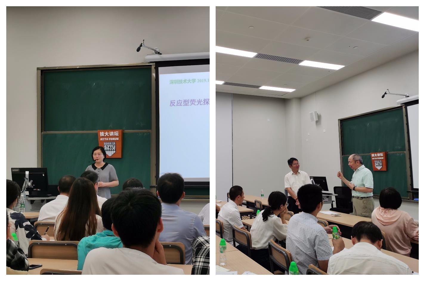 2019年10月10日,来自南京大学的沈珍教授和香港中文大学的陈建成教授应邀来访欧冠官方网站入口,做客“技大讲坛”,为我校师生带来两场主题分别为“反应型荧光探针的设计及其在活体细胞成像中的应用”和“第9组金属卟啉催化用水氢化和氧化碳-碳σ单键”的讲座。健康与环境工程学院院长胡俊青教授主持了讲座,约有八十名我校师生前来参加。 沈珍教授主要报告了以下几例基于BODIPY染料的反应型荧光探针及其在活体细胞成像中的...