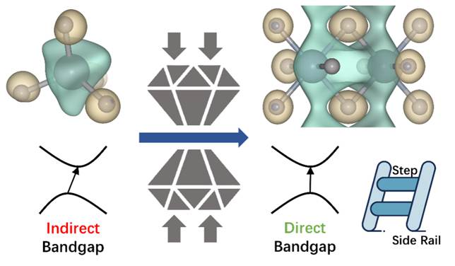 图|CaGa2O4尖晶石结构中,电子的排布方式的转变:PIPR诱导电子从0D孤立的电子分布向1D Ladder-like电子分布转变,同时,电子结构由间接带隙转变为直接带隙。